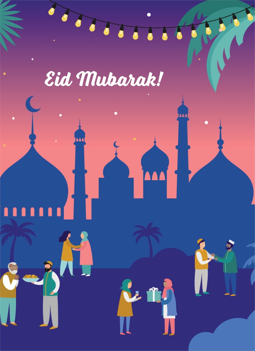 Muslim and Sikh Holiday Cards Option 1 HOLIDAYEid al-AdhaLantern against a dark sky. Option 2 HOLIDAYBandi Chhor Divas | WishesHand cupping a candle flame at dusk. Option 3 HOLIDAYEid al-Fitr | Eid Mubarak!People connecting at sunset. Option 4 HOLIDAYVaisakhi | Happy VaisakhiOrange greetings with a colorful drum.
